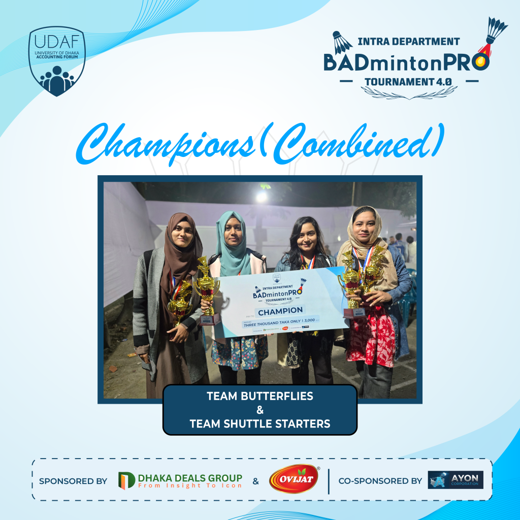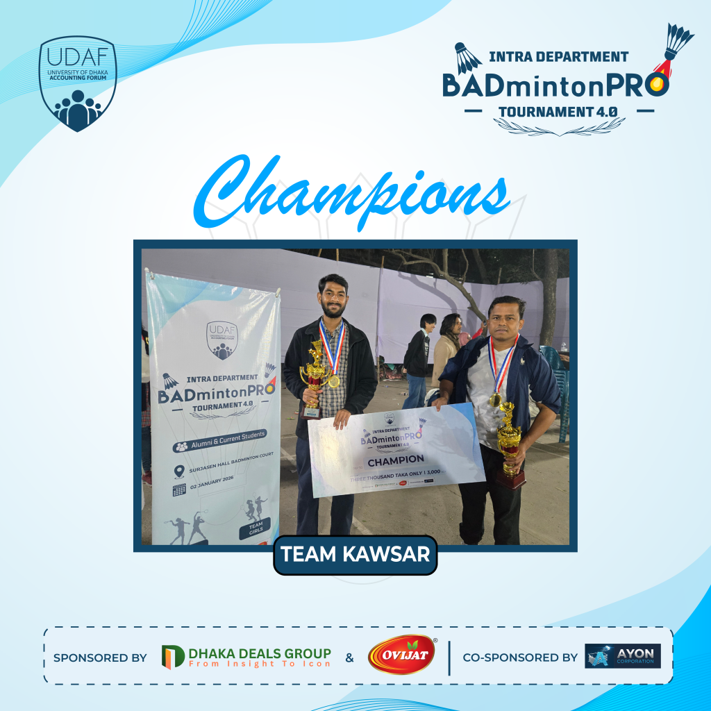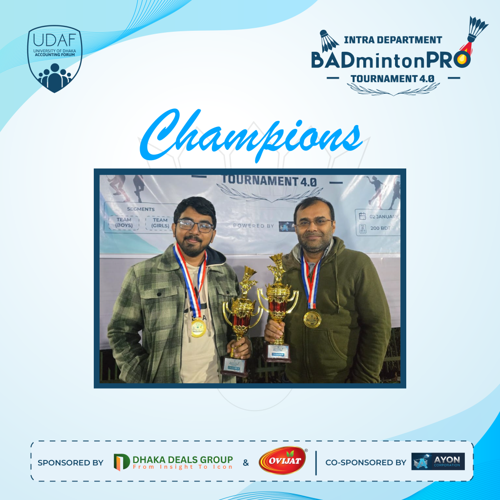 The BADmintonPro Tournament 4.0 served as a testament, united the department with enthusiasm, promoted teamwork, and shared appreciation for the sporting spirit within our academic community. The collaborative effort between segments and memorable, skillful performances underscored the positive impact of such events. We extend our warm appreciation to Ovijat Group, Dhaka Deals Group and Ayon Corporation for their continuous support and inspiration.